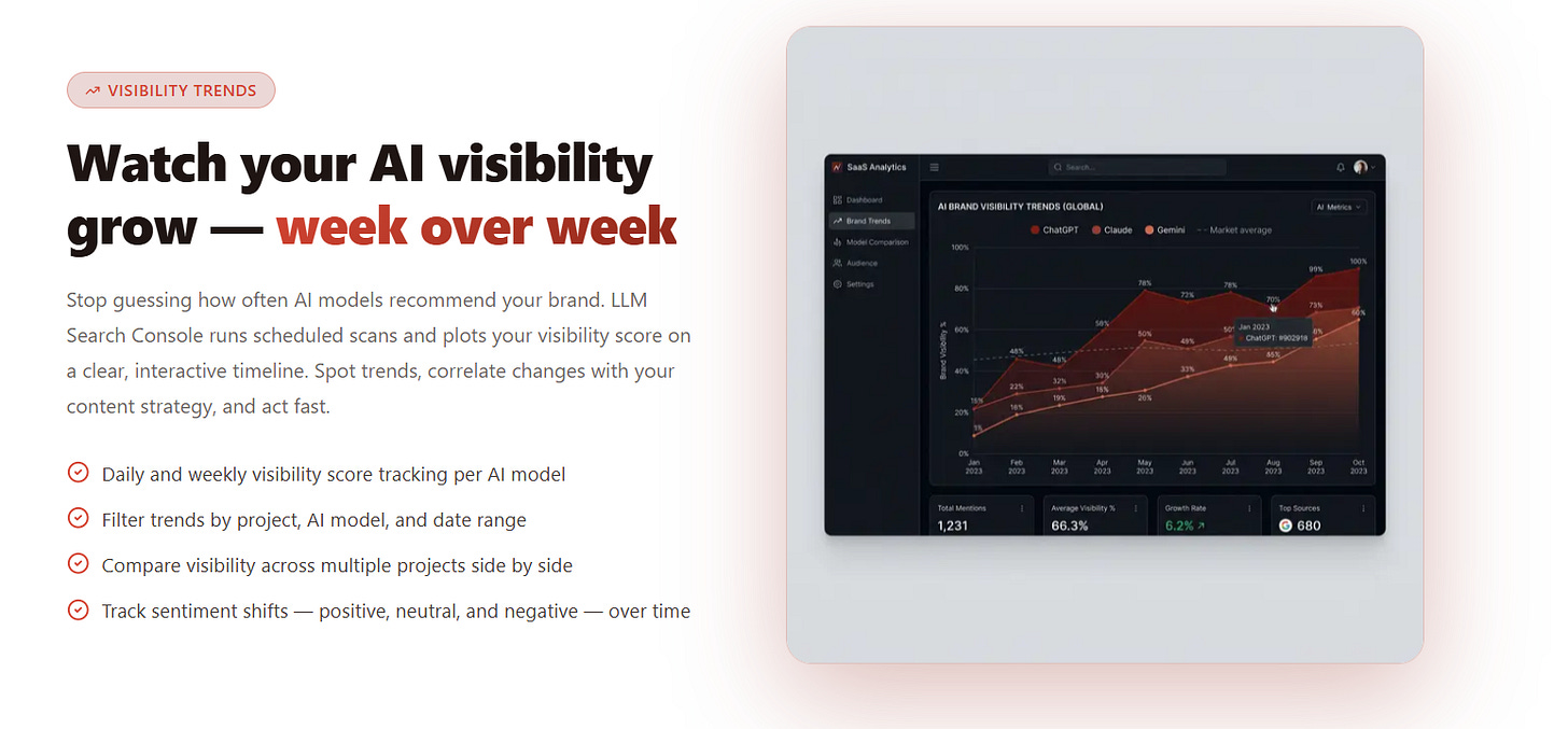 LLM Search Console tracks your brand’s mentions across ChatGPT, Gemini, Grok, Claude, and Perplexity — giving you the inference equivalent of a keyword ranking report. Think of it as console.log() for your AI visibility: you can’t debug what you can’t see. Benchmark your token efficiency (how concisely your content fits into a model’s context window), identify inference gaps (queries where competitors appear but you don’t), and measure visibility trends over time. Visit llmsearchconsole.com to run your first report.